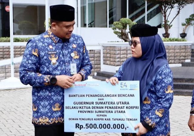 Medan – Gubernur Sumatera Utara (Sumut) Muhammad Bobby Afif Nasution yang juga Ketua Penasehat KORPRI Sumut menyerahkan bantuan bencana alam kepada Tapanuli Tengah sebanyak 500 juta bertempat di Kantor Gubernur Sumatera Utara, Rabu (17/12/25).