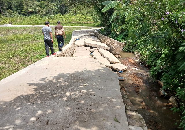 “Jalan ini rusak sejak 26 November 2025 akibat tanah longsor yang menutupi sungai di sisi jalan, sehingga mengakibatkan kerusakan parah,” jelas Erni.