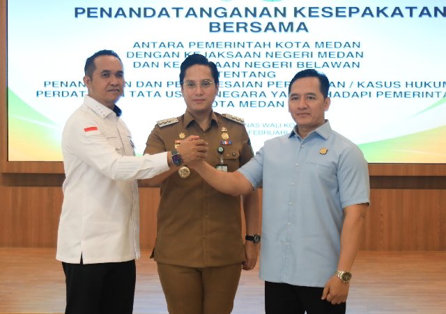 Kerja sama ini ditandai dengan penandatanganan Kesepakatan Bersama Antara Pemko Medan dengan Kejaksaan Negeri Medan dan Kejaksaan Negeri Belawan Tentang Penanganan dan Penyelesaian Persoalan/Kasus Hukum Perdata dan Tata Usaha Negara Yang Dihadapi Pemerintah Kota Medan, di Rumah Dinas Wali Kota Medan, Selasa (10/2/2026).